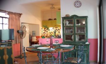 The villa is decorated in bold bright tropical colors with hand-made Talavera tiles and mosaic designs. The furnishings are one-of-a-kind pieces whimsically painted by local island artists. The Mambo House has a natural limestone waterfall cascading into the shallow wading pool, and then flowing into the main swimming pool, all surrounded by a lush tropical garden.