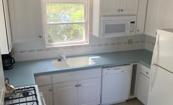 The interior is equipped with a King bed in the main bedroom, and a pull-out couch in the living room; sleeps up to four (4) persons (preferably no more than 3 adults) but is perfect for a small family (please inquire about any needs for infants or small kids). There is a full kitchen, living room, A/C unit, ceiling fans, and complimentary WiFi. As a courtesy, we also stock the unit with beach towels, chairs, and a soft cooler for your beach-going needs. There is a beautiful pool on the property but is shared with the homeowners, along with limited parking.