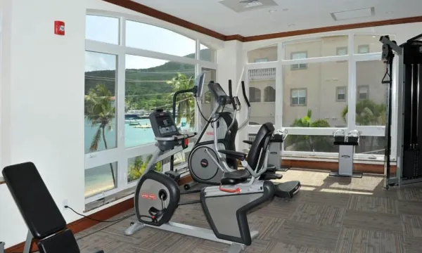 The resort provides twenty-four hour security and a reserved parking space in the garage. The heated pool and hot tub on the deck overlook the aqua blue waters of Cruz Bay. Lounge chairs are provided for relaxing and sun bathing. The on premise fitness center includes treadmills, a pilates machine, weights and a great view of the water.