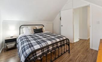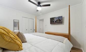 This lovely four poster bed has a high-quality, Helix brand, kind-sized mattress and snuggly blankets to stay warm and cozy. The bedroom as a nightstand with USB port and plug for your technology storage. There is a wall-mounted TV above the dresser as well.