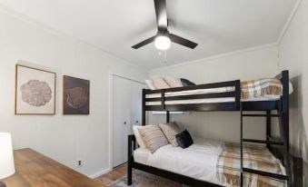 Bedroom 2 is located on the first floor and has a bunk bed with a twin over a full bed. There is a closet and dresser for storage.