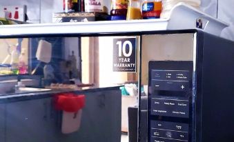 Living room and a full functional open kitchen with a washing machine which is free for guests to use. Balconies (for the living room and master bedroom).