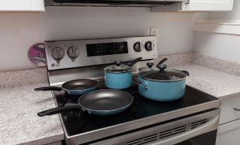 The kitchen has all of the basics for a quick stay or a long-term stay! Coffee and tea are provided with cream and sugar to start your days off right!