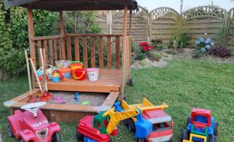 Behind the house is a beautiful garden with a furnished south-facing terrace and a sandpit with toys. If necessary, there are two sun loungers in the garage, a charcoal grill and a small "fleet" consisting of a handcart, bobby car and 2 bicycles for adults. (All existing items are welcome to be used - but they are not part of the rental property and no liability is assumed for their full functionality or in the event of injuries.)