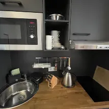 Es gab eine Bratpfanne, einen kleinen Topf, einen Topf, eine Schüssel, ein Sieb (allerdings mit grobem Sieb), eine Presse, einen Spatel, eine Zange, ein Messer und ein Schneidebrett. Sämtliches Besteck und Teller sind vorhanden. Der Kühlschrank war groß und es gab eine Spülmaschine, die ich allerdings nicht benutzt habe. Waschmittel, Handtücher und Küchenpapier waren vorhanden.