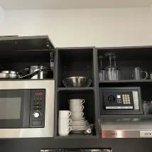 Die Küche ist für jemanden wie mich, der gerne kocht, recht praktisch. Wer nicht an europäische Öfen gewöhnt ist, ist vielleicht zunächst verwirrt, wie er zu benutzen ist, aber wenn Sie online nachschauen, werden Sie schnell zurechtkommen. Ich habe an zwei Abenden dreimal gekocht.