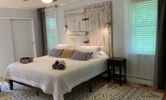 The Master bedroom has a king-sized bed with a vintage barn door, that we converted into a headboard. As you recline on the new 100% organic mattress (with luxurious mattress-topper), you’ll be looking at a photo of the sunset over the Gangha River in India. There is a lounge chair with a footstool and lamp for snuggling up with a good book. This bedroom also has a huge closet and an en-suite bathroom.