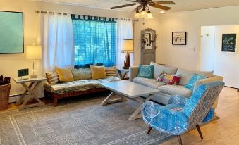 Enter through the front door, and immediately feel welcomed into our light, airy, serene home. Large windows create a bright living space and provide the feel of being connected to the outdoors. The living room includes ample, cozy seating and a pull-out queen sleeper sofa. We have a 54” TV with cable service and a designated work-space, with a desk. We offer FREE WIFI.