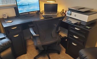 Also off the kitchen is a lounge area with a sofa , two recliners, a 35 inch TV, an electric fireplace and a work area with a large desk, monitor and printer.