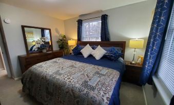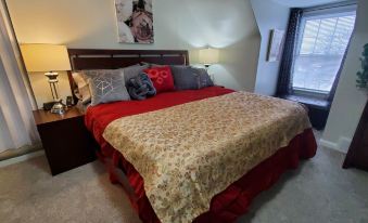 One bedroom is located on the main floor, furnished with a king size bed, mirrored dresser, closet and a 35 inch TV.