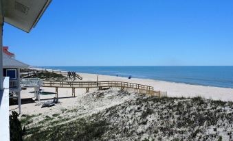 As nice as the inside of the house is, your favorite “room” in the house may just be the partially covered beachfront deck! Grab your morning coffee and enjoy a perfect view of the sunrise. Not a morning person? We have plenty of comfy seating so you can enjoy watching the dolphins play while sitting in the shade or soaking up some sunshine later in the day. The gate on the deck stairs helps to keep little ones from falling or pets from escaping. When you want to venture down to the beach, you won’t have to go far because the beach is your backyard! After your day on the beach, you can rinse off in our enclosed, outdoor shower equipped with hot and cold water. We have a fish cleaning station and a charcoal grill where you can cook up your catch or maybe some juicy steaks! We also have some fun outdoor games located in the covered outdoor area near the grill.