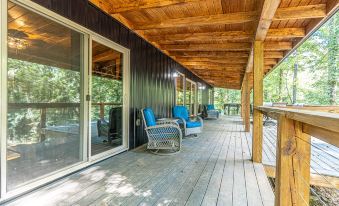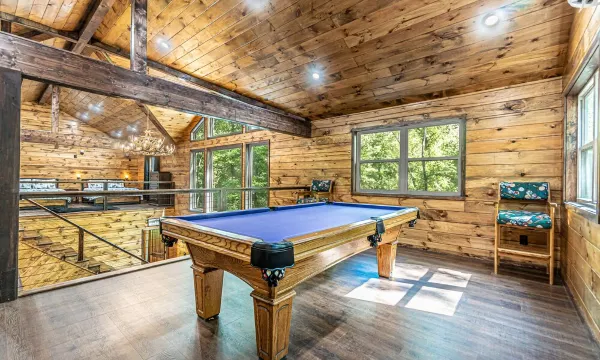 With 2 well-appointed bedrooms and a huge upstairs, our cabin accommodates 10 guests with ease. There are 2 downstairs bedrooms with king beds and en-suite bathrooms. Both bedrooms have doors leading to the large back deck. Upstairs had 3 queen beds, a pool table, arcade games, foosball table, full bathroom, washer/dryer, and a 2nd living area with a smart tv.