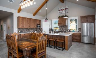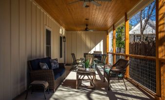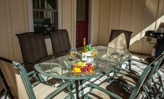 AMENITIES – 68” Flat Screen Smart TV in the living room, Smart TV in each bedroom, WiFi, large covered outdoor deck with a 7-8 person hot tub & outdoor dining & seating, outdoor corn hole game, gas grill, detached deck overlooking Baron's Creek, covered front porch with rockers, washer/dryer, walking distance to shops, restaurants, art galleries, wine tasting rooms & churches