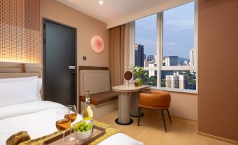 Each guestroom is designed with floor-to-ceiling windows, inviting natural light indoors and opening up to views of the city and campus. The rooms are fully equipped: a refrigerator for storing drinks and fresh fruit; a water dispenser with 1.5L bottles of Jingtian natural mineral water for instant refreshment; and a fully automatic washing machine for your laundry needs during short or extended stays. For those who love movies and shows, every room comes with a high-definition projector—free to use with hotel membership. Guests will also appreciate the trendy handheld makeup mirror, perfect for flawless touch-ups and social-media-worthy photos.