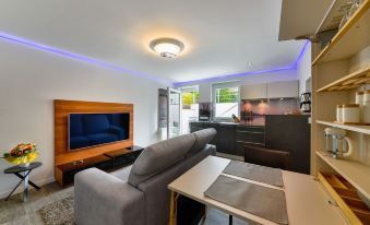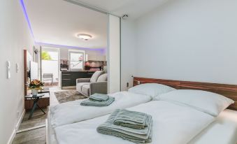 The apartment has 1 living room with retractable sliding doors to separate the bedroom (walk-in closet and double bed 160x200cm with dimmable reading lights). Great folding table by Ewe with Draenert leather chairs. Functional sofa with electrical adjustment. Team7 wall unit and 55 inch 4k Led Smart TV. with Bose Sountouch 20 and Sky Q app. Fully furnished, high-quality Alno kitchen with dishwasher, refrigerator with freezer, 80 cm ceramic hob, coffee machine, Nespresso machine etc. Completely new created (2018). Bathroom with floor-level raindance shower and decentralized ventilation system. The entire apartment has underfloor heating, electr. Remote control shutters. Sauna for sole use after consultation with the other residents of the 2nd holiday apartment.About pets:No pets allowed.About checkOut:Check out before 11:00 AM.About children:Children allowed: ages 0-17.About checkIn:Check in after 4:00 PM.About smoking:Smoking allowed: in designated areas.About events:No events allowed.