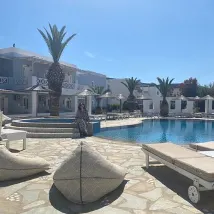 We are staying at the hotel now. It is a simple but elegant hotel with all the charm of Greek island living. The staff are fabulous, friendly, courteous and so helpful. The rooms are very clean, the common areas also and the outside breakfast/lunch/ dinner areas are magical. It is indeed a beautiful but simple & magical hotel with all the comforts within a fingertip reach. There is a small supermarket right next door, taverns a few meters away, the beach right across the road & an amusement park for children. A wonderful stay for us.