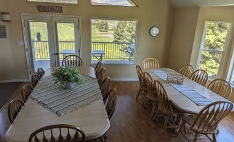 Spacious dining area with tables and bar for seating large groups. Open area living room on the main with gas fireplace and full length deck that overlooks the golf course. Downstairs features a family room with wood stove and a huge garage and storage area.
