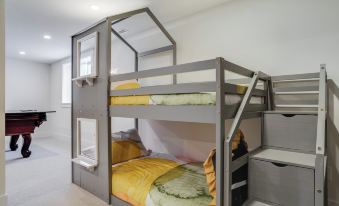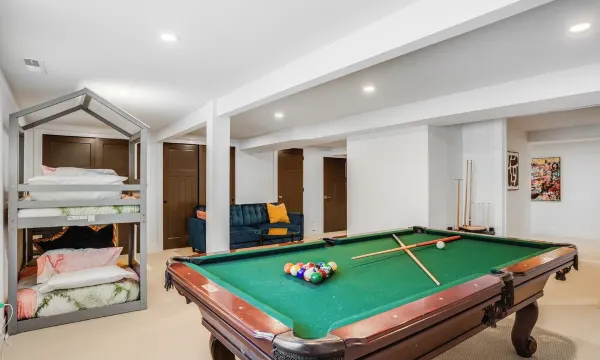 3. Downstairs is a bedroom with pool table and bunk beds and Queen sofa bed