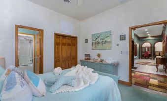 Our expansive primary bedroom suite offers a luxurious retreat, featuring a projector for a cinematic experience in the comfort of your bed. Four bedrooms boast en suite bathrooms, while two additional bedrooms share a separate full bathroom.