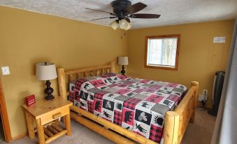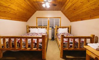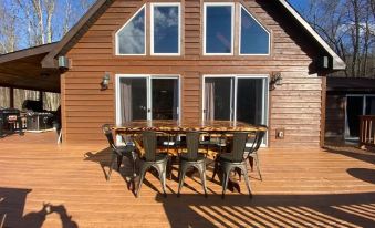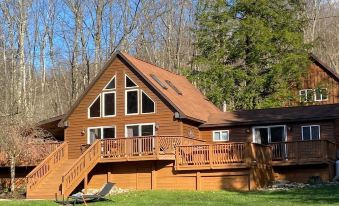 A beautiful chalet with cathedral ceilings located within 2.5 miles of the Wisp and under 5 miles to the Lake. The property sits among seven acres of land that includes a pond, a hot tub and fire pit. Inside the Cabin there’s a spacious open floor plan with a well-stocked large kitchen, dining and living room that includes a gas fireplace with a tv. There are two bedrooms and a loft with two beds. There is one bathroom and a washer and dryer located feet from the master bedroom. This property comfortably sleeps seven. Perfect for a memorable mountain vacation minutes from Deep Creek Lake.
