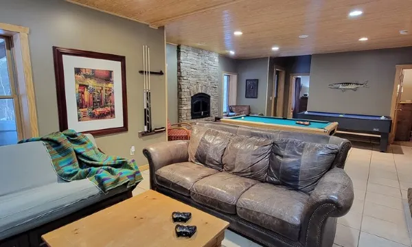 *LOWER LEVEL has heated tile floors, wood burning heat and glo fireplace, large windows, second living area, 2 comfortable bedrooms and game room with slate pool table and air hockey. One bedroom has a queen bed and bunk bed and the other has a bunk bed and roll away bed. Both share a full bath that is attached to the queen/bunk room.