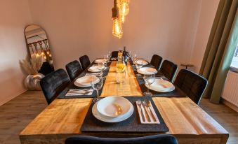 The living room impresses with a spacious dining area where all guests can sit comfortably. Adjacent to this is the cozy seating area with two sofas and a large smart TV. From the dining area, you can also enjoy Netflix – perfect for a relaxing entertainment experience.