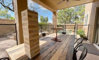 The ground floor has a wide open vaulted-ceiling living room with a queen sleeper sofa and dining area with an extra-long hardwood table that seats 12. Adjacent is a fully equipped chef's kitchen with gas stove, stainless refrigerator, dishwasher and microwave, and quartz countertops with a peninsula & breakfast bar that seats three. The kitchen opens into a cozy family room with a gas fireplace, 65" HDTV, sofa and chairs. A sliding glass door takes you outside to a covered patio with table and chairs, gas BBQ grill, grassy play yard with space for playing cornhole, giant Jenga, and our other outdoor games, as well as a beautiful fenced-in pebble-lined pool with jetted hot tub and waterfall features. Relax by the pool in a lounge chair or enjoy our pool floats & toys. There’s also a wood-burning fire pit in the backyard & roasting sticks for making s’mores. (Pool & spa can be heated year-round for a charge of $50/night or $300/week. Spa heating without pool heating is $25/night or $150/week. If desired, please request heating prior to check-in.)