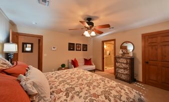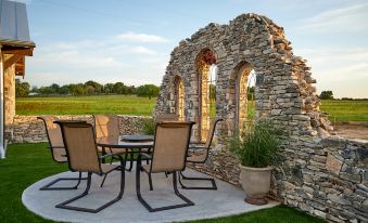 When you arrive, you will love the solid hickory floors. Additionally, the knotty Alder cabinets and a beautiful limestone fireplace in the great room invite you to stay a while. Each bedroom was inspired by a local wine. The Tannat Master Suite has a king size bed, sitting area and private bathroom. The Tempranillo Suite has a queen size bed and a semi-private bathroom. The great room has a vaulted ceiling and plenty of cozy seating. Situated in front of the fireplace is a luxury leather sofa with a queen size pull-out mattress that will inflate to 11 inches and has an adjustable headrest for reading, watching TV or staring at the fire. Gateway Cabin has a fully equipped kitchen with a long island and three counter stools. The front porch spans the entire length of the cabin and is a great spot to enjoy your morning coffee or evening glass of wine. The back porch gives you a wonderful sunset view as well as access to the shared courtyard. No smoking, no pets and no children in this home, please.