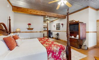 At night, the Champagne Suite can accommodate as many as two guests in its one-bedroom, one-bathroom space. The bedroom features rustic wood paneled walls and a king-size bed with a floral coverlet. The spacious full bathroom has a large vanity and a stall shower. Feel free to bring your dog for a small, nightly pet fee (please note a 30 lb weight limit).