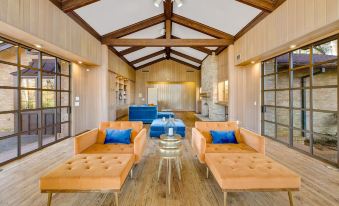 The second family is right of the Elvis room, and it features floor to ceiling windows. The sliding doors open the patio on one side or the pathways on the other. Another beautiful fireplace and mantle in this area as well. This room has warm wood flooring and wood paneling. Beautifully appointed with period appropriate mid century modern furnishings. Both living rooms have vaulted ceilings and are just so open and inviting.