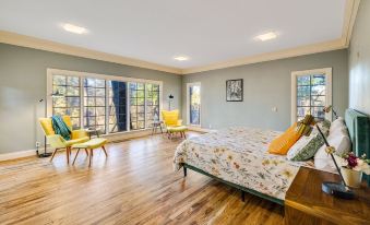 The home also features two huge family rooms. The main family room off of the grand entrance has a huge wood burning fireplace with an equally impressive wood mantle. Features a wet bar, plenty of seating, and huge floor to ceiling sliding glass doors. These doors truly allow for feng shui. The door opens wide to allow guests to flow between the inside and outside areas. Home and nature come together. Perfect for morning yoga (no goats please😊) or just reading on coffee. Later family gatherings for drinks, games, or just good conversation.