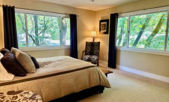 The house is beautiful, comfortable and serene. We enjoyed sitting out on the deck overlooking the peaceful river in the comfy chairs. We also enjoyed the location - a great quiet little neighborhood very close to the heart of Glen Ellen. Les Pascales French bakery and the Jack London Saloon were big hits with our family.