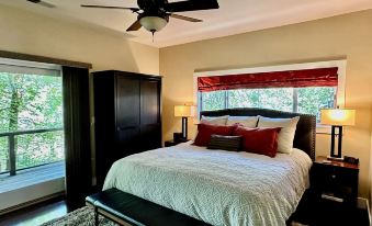 Wolf Glen features 4 spacious bedrooms/5 bathrooms (3 full, 2 half), 2 bedrooms with new Tempur-Pedic king beds and 2 with queen beds fitted with fine quality linens; two of the bedrooms are en-suite with dual sinks, showers, and lavish soaking tubs. There are additional twin mattresses available to accommodate additional sleeping configurations. Three of the bedrooms have sliding doors with direct access to decks overlooking the beautiful Sonoma Creek and amazing scenery.