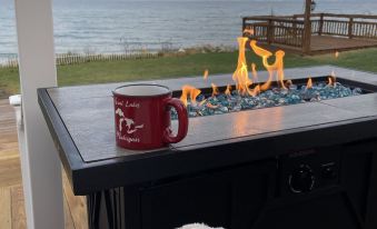 The main (second) floor has two living areas. One has a TV with a gaming system and DVD player, a game table with poker and bumper pool, and a gas fireplace with a couch and two recliners. The other overlooks Lake Michigan with several reclining chairs and a couch to enjoy the view. It has a smart TV, gas fireplace, and coffee bar.