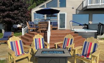 In addition to the private master balcony, our lake house has two decks. The back deck overlooks Lake Michigan and holds a six-person hot tub, four Adirondack chairs, a gas fire table, a warm-water outdoor shower, and a patio furniture set with umbrella that seats seven. The front deck has a large Weber grill and patio table and chairs with an umbrella that seats six. We also provide four lounge chairs, puzzles and games throughout the house, lots of books, and a corn hole set. In addition to cookware, dinnerware, and silverware, we offer wine glasses and beer mugs as well as plastic dishes/cups for outdoor use.
