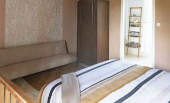 The farmhouse features two inviting bedrooms, one with a queen bed and the other with a twin bed and a crib, ensuring comfort for all guests. Both bathrooms are well-appointed, each equipped with a bathtub and toilet, offering the perfect space to unwind after a day of adventure. The cozy living room, complete with a sofa bed, provides a warm and welcoming area to gather, relax, and create lasting memories.