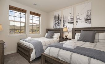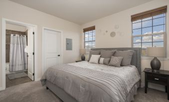 The primary bedroom features a spacious King bed accompanied by a full en-suite bathroom. Activate the electric fireplace to create a cozy atmosphere, or venture outside to the private deck to enjoy the scenic mountain views.