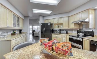 Step into an open concept living area that welcomes you with ample seating, tasteful decor, and a cozy ambiance. The great room features large windows that frame breathtaking views of the lake and fill the space with natural light. Enjoy a movie night with the smart TV or gather around the indoor fireplace on cooler evenings. The adjoining kitchen is fully stocked with stainless steel appliances, a coffee maker, and all the cooking basics—ideal for whipping up anything from a light breakfast to a gourmet dinner. Share meals at the formal dining table and savor morning coffee in the back porch area overlooking the water.
