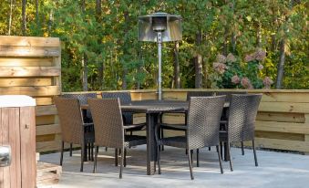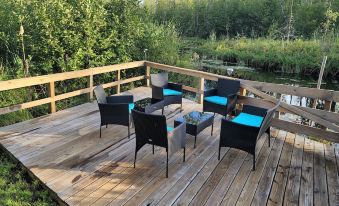 A walkway down to a deck on the Creek/River with seating.About pets:Pets allowed: dogs (limit 2 total).About checkOut:Check out before 11:00 AM.About children:Children allowed: ages 0-17.About checkIn:Check in after 4:00 PM.About smoking:Smoking allowed: in designated areas.About minBookingAge:Minimum age to rent: 21.About events:No events allowed.