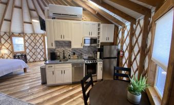 Tucked away on 73 acres of private land, enjoy being surrounded by nature while also having access to modern necessities in this newly built yurt. Perfect for a couple’s retreat, this open concept layout offers a comfortable king size bed, small sitting area with sleeper sofa, and a kitchenette/dining space that will meet all of your needs during your stay. Additionally, there is a full bathroom in-unit so there is no need to brave the wild in the middle of the night.