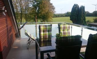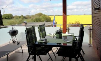 An approximately 16 m² loggia with a view of meadows and fields invites you to grill, sunbathe and relax.