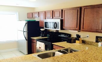 The living room is furnished with one sofa sleeper and one love seat, flat screen tv with cable and internet included, and opens to the dining room and the kitchen & bar area . The kitchen is perfect for dining as it is equipped with all stainless type appliances including refrigerator with icemaker, dw, microwave, disposal, glasstop stove, pantry, granite countertops, and barstools. The kitchen is fully furnished with all dishes, glassware, pots, pans, silverware, coffemaker and toaster to enable comfortable times when cooking.