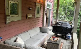 2 full length covered porches, with comfy furniture & lighting, provide wonderful outside space to relax & enjoy the gorgeous woodsy setting. 1. Mid/main level 2. Lower level…enjoyable day or night, rain or shine. House has 3 gas fireplaces - one per floor. They are used Sept- May; not available during summer months. Locations- Main floor: living room, Lower floor: den space, Top floor in master en-suite.