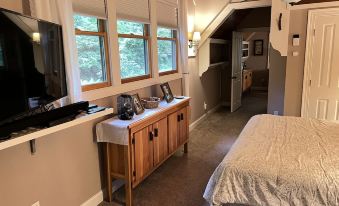 Lower level: living /den space, w/fireplace & slider door porch access , queen bedroom/full shower-tub bathroom, (also slider door to access back porch), and a desk/work area with high speed wifi internet with Ethernet connection and laundry.