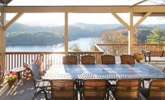 The oversized porch captures a breathtaking view of Lake Glenville and overlooks the surrounding mountain range. Sit in one of the rocking chairs, benches, or swing, breathe in the mountain air, and keep watch for a bald eagle and other wildlife we share the land with. It makes for the perfect place to enjoy your morning coffee, eat al fresco on the outdoor dining table fit for 10, and fire up the extra large gas grill for a BBQ. For an indoor dinner, we offer our reclaimed wood dining room table set for 10.