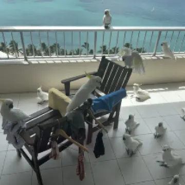 Sobald man die Balkon-Schiebetür im Haus öffnet, sieht man eine Reihe Sonnenblumenpapageien auf dem Balkon stehen.
