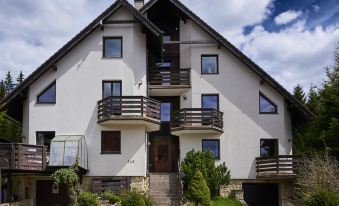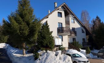 Gemütliches, freistehendes Appartementhaus auf 3 Stockwerken, Baujahr 2000, umgeben von Bäumen. 3 Wohnungen in der Residenz. Im Ortsteil Klondajk, zentrale, ruhige Lage, 1 km vom Skigebiet. Zur Mitbenutzung: Garten. Im Hause: Zentralheizung. Parkplatz (für 8 Autos) beim Haus. Einkaufsgeschäft 200 m, Einkaufszentrum 10 m, Bäckerei 10 m, Fußgängerzone, Bushaltestelle "Harrachov, U sklárny" 800 m, Bahnstation "Harrachov, Mýtiny" 2 km, Freibad 1 km. Tennis 1 km, Wanderwege ab Haus 10 m, Radweg 100 m, Skilift 700 m, Skiverleih 700 m, Skischule, Kinderskischule. Nahe gelegene Sehenswürdigkeiten: Bobová dráha 1 km, Sklárna Novosad a syn 500 m, Mumlavský vodopád 2 km, Terenní tříkolky Hilbert+ lyžařský vlek 700 m, Skokanské můstky 1.3 km, Polsko - vodopád 6.6 km. Bekannte Skigebiete sind gut erreichbar: Harrachov 1 km, Rokytnice nad Jizerou 14 km, Rejdice, Tanvaldský Špičák, Paseky n/J. Bekannte Seen in der Umgebung sind gut erreichbar: Jablonecká přehrada 30 km. Wandergebiete: Western City(Pl) 40 km, Karpacz Wang,Park miniatury Kowary (Pl) 44 km, Giganteria Piechowice 23km, Dinopark(Pl) 15 km. Bitte beachten: kein Fahrstuhl vorhanden.