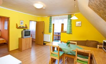 Kinderfreundliches, gemütliches Appartementhaus auf 3 Stockwerken. Im Ort, 200 m vom Zentrum von Harrachov, erhöhte Lage, 600 m vom Skigebiet, 500 m vom Fluss. Zur Mitbenutzung: Grundstück, Garten. Gartenmöbel, Grill, Feuerstelle, Kinderspielplatz (Rutschbahn, Schaukel, Sandkasten). Im Hause: Zentralheizung. Frühstück (extra). Abstellraum vorhanden. Parkplatz beim Haus. Lebensmittelgeschäft, Restaurant 300 m, Café 500 m, Fahrradverleih 300 m, Bushaltestelle "Harrachov, aut.nádr." 500 m, Bahnstation "Harrachov" 4 km, Freibad 1 km. Golfplatz (9 Loch) 4.5 km, Tennis 1 km, Skilift, Sessellift, Skipisten, Skiverleih, Skischule 600 m, Langlaufloipe 200 m. Nahe gelegene Sehenswürdigkeiten: Skokanské můstky Harrachov 1 km, Mumlavský vodopád 1 km, Bobová dráha, Muzeum skla 2 km, Vosecká bouda, Dvořačky 9 km, Huťský vodopád 9 km, Vodopád Kamienczyka, Szklarki (PL) 12 km. Bekannte Skigebiete sind gut erreichbar: Čertova hora 600 m, Zákoutí 600 m, Ryžoviště 1.4 km, Kořenov 7 km, Rokytnice nad Jizerou 15 km. Bekannte Seen in der Umgebung sind gut erreichbar: Vodní nádrž Souš 15 km. Wandergebiete: Western City(Pl) 40 km, Karpacz Wang,Park miniatury Kowary (Pl) 44 km, Giganteria Piechowice 23km, Dinopark(Pl) 15 km.