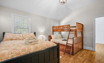 Go upstairs to the three bedrooms and additional bathrooms on the upper level. The primary bedroom is to the right with a king sized bed and ensuite bathroom #2 with a glass enclosed shower and separate soaking tub. There is a large walk-in closet for all your outfit changes. Don't forget the balcony overlooking the front yard and beyond. What a view to start and end each day!