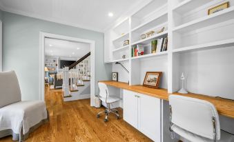 There is a queen bedroom on the first level. Bathroom #1 with a shower is in the hallway as you make your way to the office with two work stations and lots of room to get remote work done before the beach fills up!